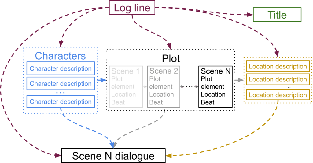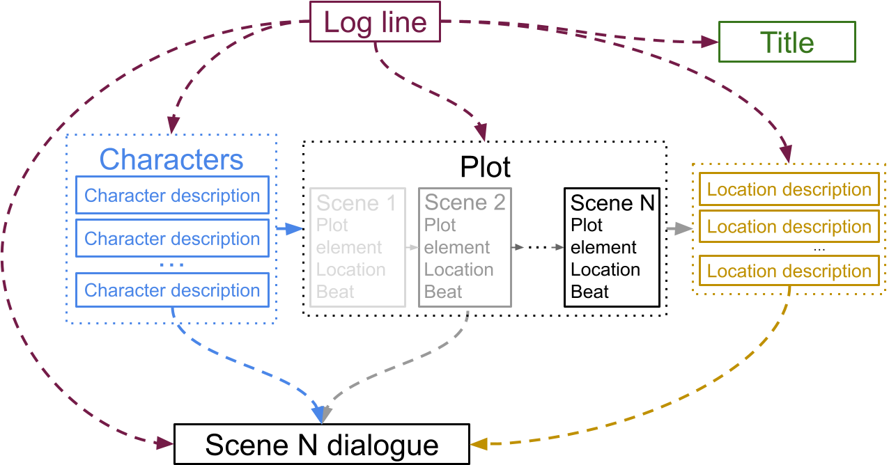 Language models are increasingly attracting interest from writers. However, such models lack long-range semantic coherence, limiting their usefulness for longform creative writing. We address this limitation by applying language models hierarchically, in a system we call Dramatron. By building structural context via prompt chaining, Dramatron can generate coherent scripts and screenplays complete with title, characters, story beats, location descriptions, and dialogue. We illustrate Dramatron’s usefulness as an interactive co-creative system with a user study of 15 theatre and film industry professionals. Participants co-wrote theatre scripts and screenplays with Dramatron and engaged in open-ended interviews. We report critical reflections both from our interviewees and from independent reviewers who watched stagings of the works to illustrate how both Dramatron and hierarchical text generation could be useful for human-machine co-creativity. Finally, we discuss the suitability of Dramatron for co-creativity, ethical considerations — including plagiarism and bias — and participatory models for the design and deployment of such tools.