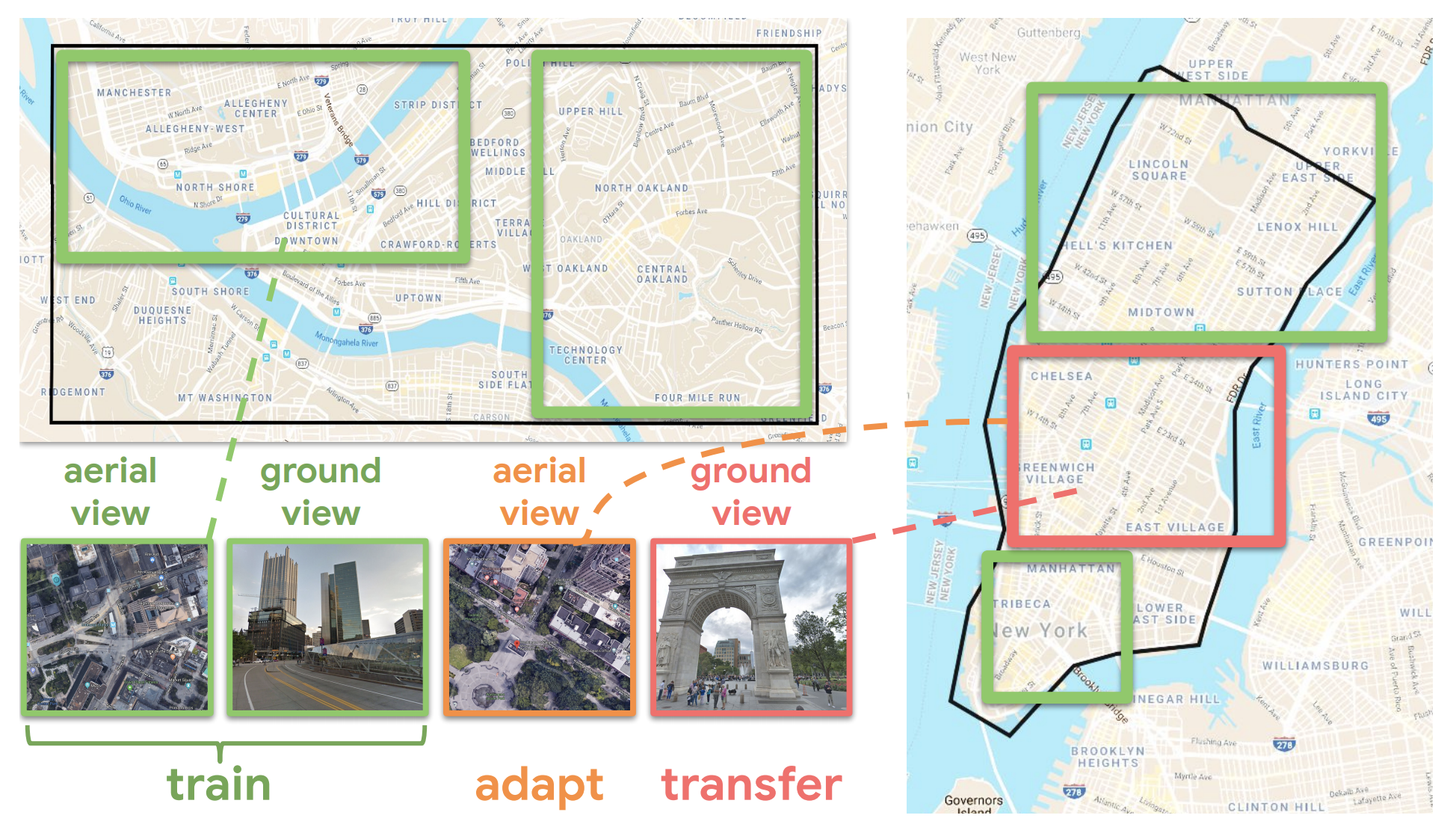 with an aerial view and to learn a joint policy that is transferable across views. We achieve this by learning a similar embedding space for both views, distilling the policy across views and dropping out visual modalities. We further reformulate the transfer learning paradigm into three stages: 1) cross-modal training, when the agent is initially trained on multiple city regions, 2) aerial view-only adaptation to a new area, when the agent is adapted to a held-out region using only the easily obtainable aerial view, and 3) ground view-only transfer, when the agent is tested on navigation